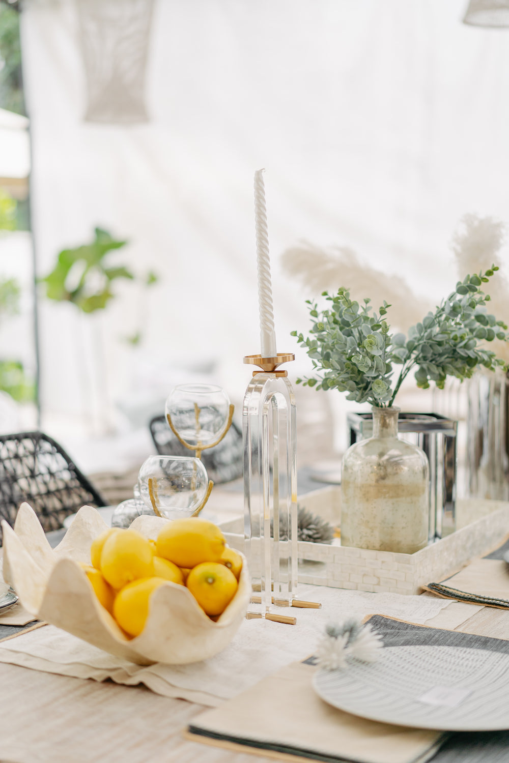 We will provide you with fresh seasonal flowers and candles to style your centrepiece with, and take home after. Worth $80.